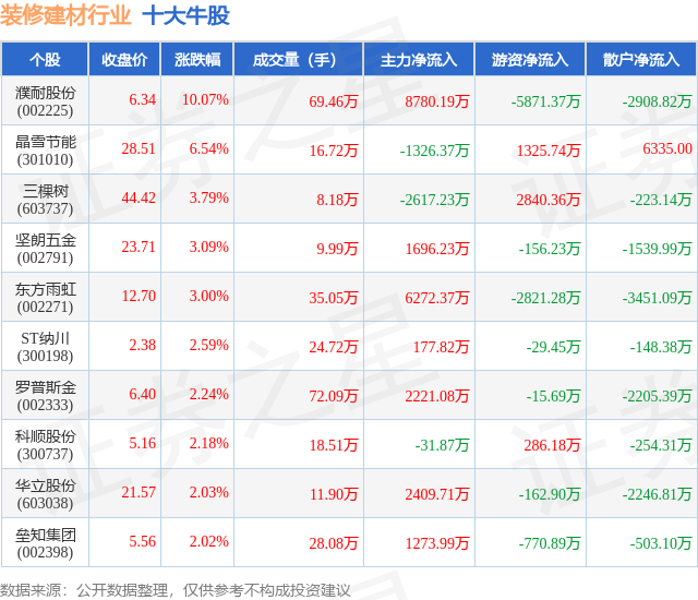 个股表现方面,装修建材行业当日领涨股为濮耐股份(002225),该股当日报收6.34,上涨10.07%,成交量69.46万,主力资金净流入8780.19万元。晶雪节能(301010)以上涨6.54%紧随其后,该股当日成交量16.72万,主力资金净流出1326.37万元。除此之外,三棵树(603737)、坚朗五金(002791)、东方雨虹(002271)均进入当日牛股之列。具体个股列表见下表: