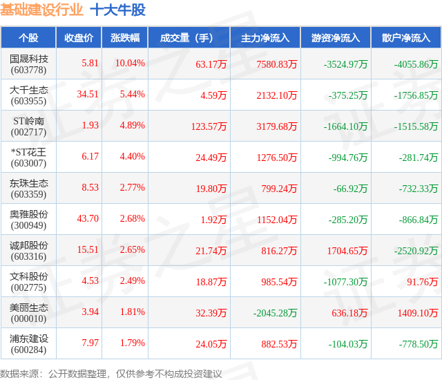 个股表现方面,基础建设行业当日领涨股为国晟科技(603778),该股当日报收5.81,上涨10.04%,成交量63.17万,主力资金净流入7580.83万元。大千生态(603955)以上涨5.44%紧随其后,该股当日成交量4.59万,主力资金净流入2132.1万元。除此之外,ST岭南(002717)、*ST花王(603007)、东珠生态(603359)均进入当日牛股之列。具体个股列表见下表: