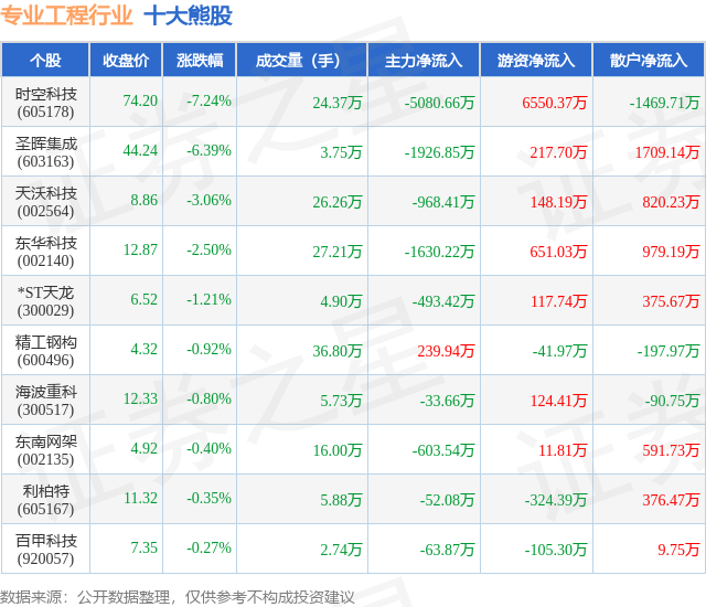 个股表现方面,专业工程行业当日领跌股为时空科技(605178),该股当日报收74.2,下跌7.24%,成交量24.37万,主力资金净流出5080.66万元。圣晖集成(603163)以下跌6.39%紧随其后,该股当日成交量3.75万,主力资金净流出1926.85万元。除此之外,天沃科技(002564)、东华科技(002140)、*ST天龙(300029)均进入当日熊股之列。具体个股列表见下表: