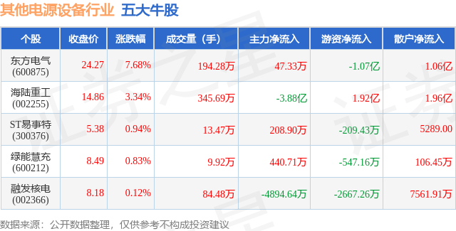 个股表现方面,其他电源设备行业当日领涨股为东方电气(600875),该股当日报收24.27,上涨7.68%,成交量194.28万,主力资金净流入47.33万元。海陆重工(002255)以上涨3.34%紧随其后,该股当日成交量345.69万,主力资金净流出3.88亿元。除此之外,ST易事特(300376)、绿能慧充(600212)、融发核电(002366)均进入当日牛股之列。具体个股列表见下表: