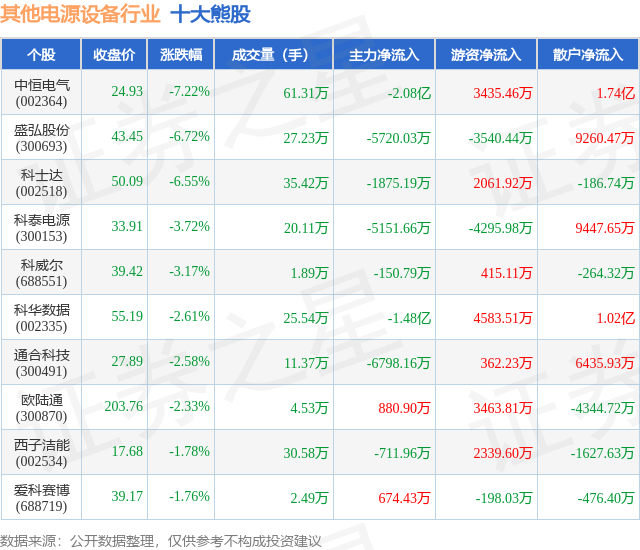 个股表现方面,其他电源设备行业当日领跌股为中恒电气(002364),该股当日报收24.93,下跌7.22%,成交量61.31万,主力资金净流出2.08亿元。盛弘股份(300693)以下跌6.72%紧随其后,该股当日成交量27.23万,主力资金净流出5720.03万元。除此之外,科士达(002518)、科泰电源(300153)、科威尔(688551)均进入当日熊股之列。具体个股列表见下表: