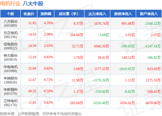 个股表现方面,电机行业当日领涨股为八方股份(603489),该股当日报收31.85,上涨4.39%,成交量8.37万,主力资金净流入1676.74万元。方正电机(002196)以上涨2.98%紧随其后,该股当日成交量204.6万,主力资金净流出3.68亿元。除此之外,佳电股份(000922)、神力股份(603819)、中电电机(603988)均进入当日牛股之列。具体个股列表见下表:
