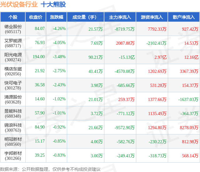 个股表现方面,光伏设备行业当日领跌股为德业股份(605117),该股当日报收84.07,下跌4.26%,成交量21.57万,主力资金净流出8719.75万元。艾罗能源(688717)以下跌4.05%紧随其后,该股当日成交量7.69万,主力资金净流入2087.88万元。除此之外,阳光电源(300274)、横店东磁(002056)、快可电子(301278)均进入当日熊股之列。具体个股列表见下表: