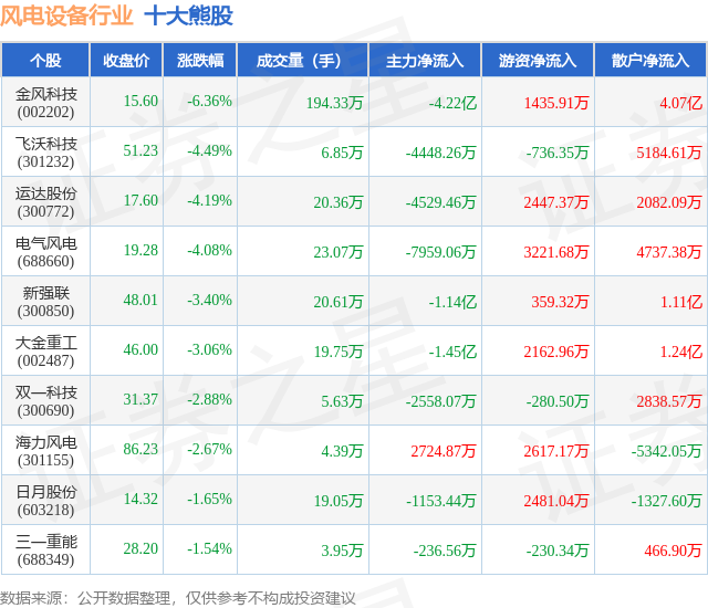 个股表现方面,风电设备行业当日领跌股为金风科技(002202),该股当日报收15.6,下跌6.36%,成交量194.33万,主力资金净流出4.22亿元。飞沃科技(301232)以下跌4.49%紧随其后,该股当日成交量6.85万,主力资金净流出4448.26万元。除此之外,运达股份(300772)、电气风电(688660)、新强联(300850)均进入当日熊股之列。具体个股列表见下表: