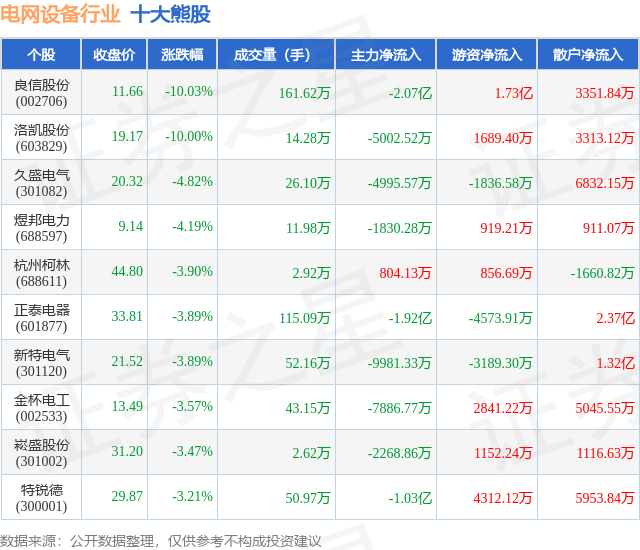 个股表现方面,电网设备行业当日领跌股为良信股份(002706),该股当日报收11.66,下跌10.03%,成交量161.62万,主力资金净流出2.07亿元。洛凯股份(603829)以下跌10.0%紧随其后,该股当日成交量14.28万,主力资金净流出5002.52万元。除此之外,久盛电气(301082)、煜邦电力(688597)、杭州柯林(688611)均进入当日熊股之列。具体个股列表见下表: