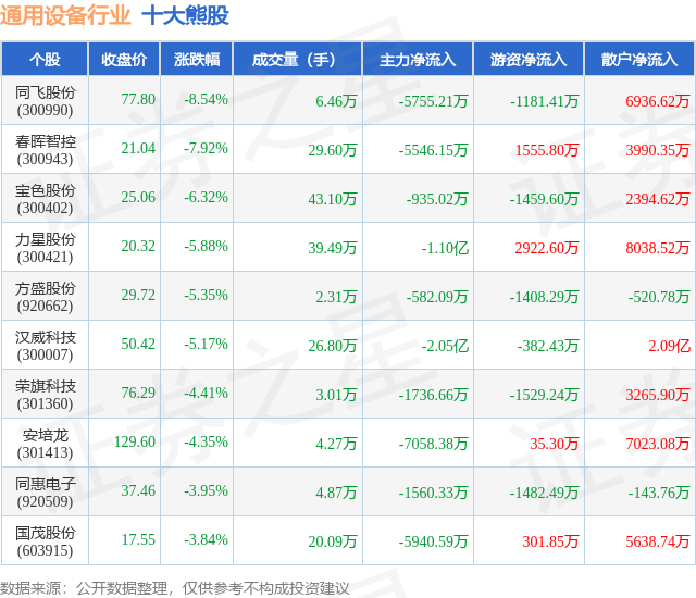 个股表现方面,通用设备行业当日领跌股为同飞股份(300990),该股当日报收77.8,下跌8.54%,成交量6.46万,主力资金净流出5755.21万元。春晖智控(300943)以下跌7.92%紧随其后,该股当日成交量29.6万,主力资金净流出5546.15万元。除此之外,宝色股份(300402)、力星股份(300421)、方盛股份(920662)均进入当日熊股之列。具体个股列表见下表: