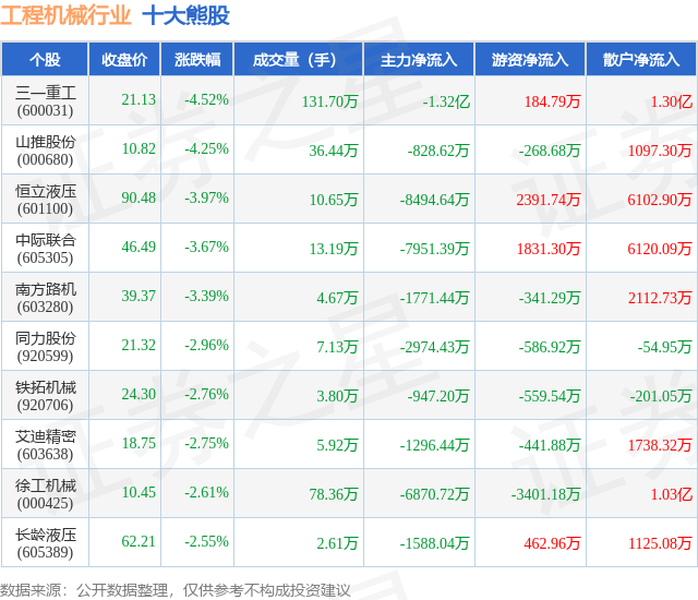 个股表现方面,工程机械行业当日领跌股为三一重工(600031),该股当日报收21.13,下跌4.52%,成交量131.7万,主力资金净流出1.32亿元。山推股份(000680)以下跌4.25%紧随其后,该股当日成交量36.44万,主力资金净流出828.62万元。除此之外,恒立液压(601100)、中际联合(605305)、南方路机(603280)均进入当日熊股之列。具体个股列表见下表: