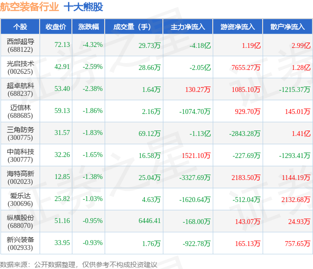 个股表现方面,航空装备行业当日领跌股为西部超导(688122),该股当日报收72.13,下跌4.32%,成交量29.73万,主力资金净流出4.18亿元。光启技术(002625)以下跌2.59%紧随其后,该股当日成交量28.66万,主力资金净流出2.05亿元。除此之外,超卓航科(688237)、迈信林(688685)、三角防务(300775)均进入当日熊股之列。具体个股列表见下表: