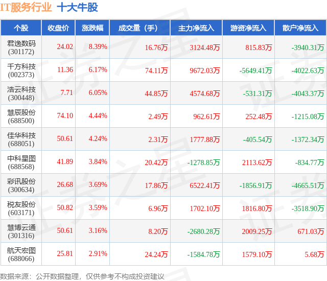 个股表现方面,IT服务行业当日领涨股为君逸数码(301172),该股当日报收24.02,上涨8.39%,成交量16.76万,主力资金净流入3124.48万元。千方科技(002373)以上涨6.17%紧随其后,该股当日成交量74.11万,主力资金净流入9672.03万元。除此之外,浩云科技(300448)、慧辰股份(688500)、佳华科技(688051)均进入当日牛股之列。具体个股列表见下表: