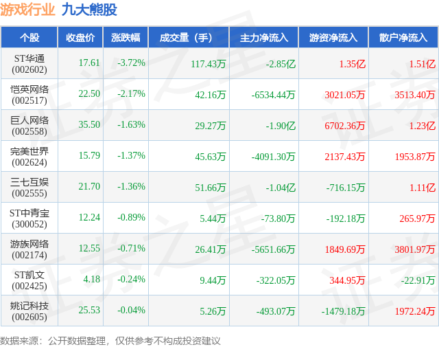 个股表现方面,游戏行业当日领跌股为ST华通(002602),该股当日报收17.61,下跌3.72%,成交量117.43万,主力资金净流出2.85亿元。恺英网络(002517)以下跌2.17%紧随其后,该股当日成交量42.16万,主力资金净流出6534.44万元。除此之外,巨人网络(002558)、完美世界(002624)、三七互娱(002555)均进入当日熊股之列。具体个股列表见下表: