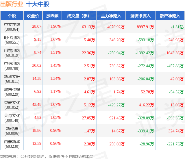 个股表现方面,出版行业当日领涨股为中文在线(300364),该股当日报收28.07,上涨1.96%,成交量63.13万,主力资金净流入4070.92万元。时代出版(600551)以上涨1.67%紧随其后,该股当日成交量15.4万,主力资金净流入346.2万元。除此之外,山东出版(601019)、中信出版(300788)、新华文轩(601811)均进入当日牛股之列。具体个股列表见下表: