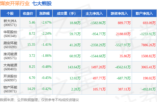 个股表现方面,煤炭开采行业当日领跌股为新大洲A(000571),该股当日报收5.46,下跌2.67%,成交量18.88万,主力资金净流出1582.86万元。华阳股份(600348)以下跌2.24%紧随其后,该股当日成交量59.75万,主力资金净流出954.77万元。除此之外,潞安环能(601699)、淮河能源(600575)、大有能源(600403)均进入当日熊股之列。具体个股列表见下表: