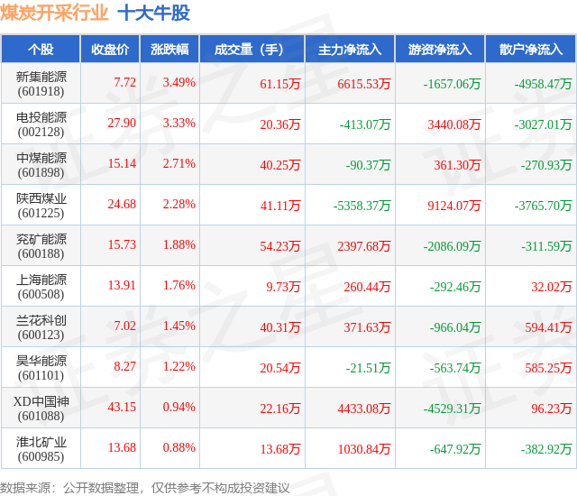 个股表现方面,煤炭开采行业当日领涨股为新集能源(601918),该股当日报收7.72,上涨3.49%,成交量61.15万,主力资金净流入6615.53万元。电投能源(002128)以上涨3.33%紧随其后,该股当日成交量20.36万,主力资金净流出413.07万元。除此之外,中煤能源(601898)、陕西煤业(601225)、兖矿能源(600188)均进入当日牛股之列。具体个股列表见下表: