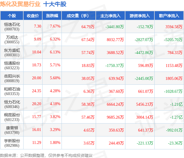 个股表现方面,炼化及贸易行业当日领涨股为恒逸石化(000703),该股当日报收7.3,上涨7.67%,成交量64.79万,主力资金净流出3441.8万元。万邦达(300055)以上涨6.32%紧随其后,该股当日成交量67.54万,主力资金净流入8032.77万元。除此之外,东方盛虹(000301)、恒通股份(603223)、岳阳兴长(000819)均进入当日牛股之列。具体个股列表见下表:
