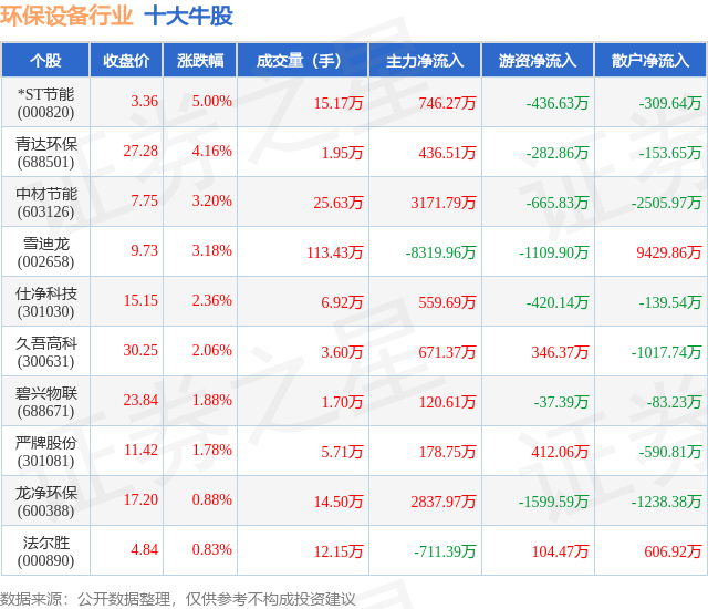个股表现方面,环保设备行业当日领涨股为*ST节能(000820),该股当日报收3.36,上涨5.0%,成交量15.17万,主力资金净流入746.27万元。青达环保(688501)以上涨4.16%紧随其后,该股当日成交量1.95万,主力资金净流入436.51万元。除此之外,中材节能(603126)、雪迪龙(002658)、仕净科技(301030)均进入当日牛股之列。具体个股列表见下表:
