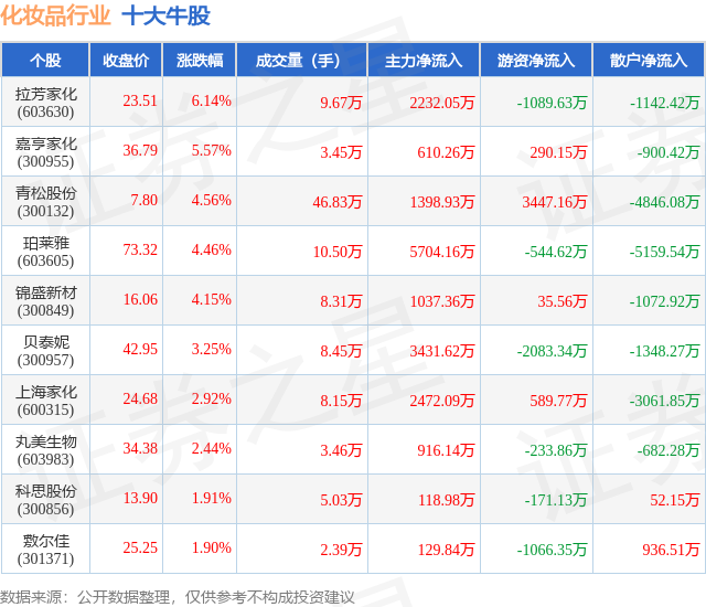 个股表现方面,化妆品行业当日领涨股为拉芳家化(603630),该股当日报收23.51,上涨6.14%,成交量9.67万,主力资金净流入2232.05万元。嘉亨家化(300955)以上涨5.57%紧随其后,该股当日成交量3.45万,主力资金净流入610.26万元。除此之外,青松股份(300132)、珀莱雅(603605)、锦盛新材(300849)均进入当日牛股之列。具体个股列表见下表: