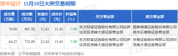 证券之星消息,11月10日郑中设计发生大宗交易,交易数据如下:
