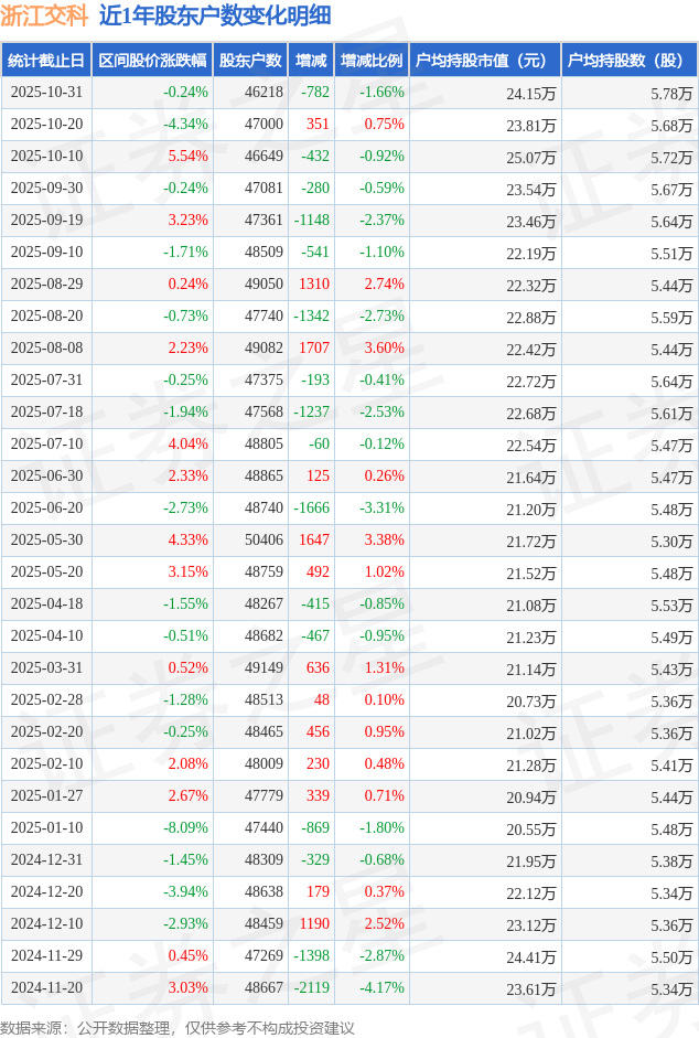 从股价来看,2025年10月20日至2025年10月31日,浙江交科区间跌幅为0.24%,在此期间股东户数减少782.0户,减幅为1.66%。