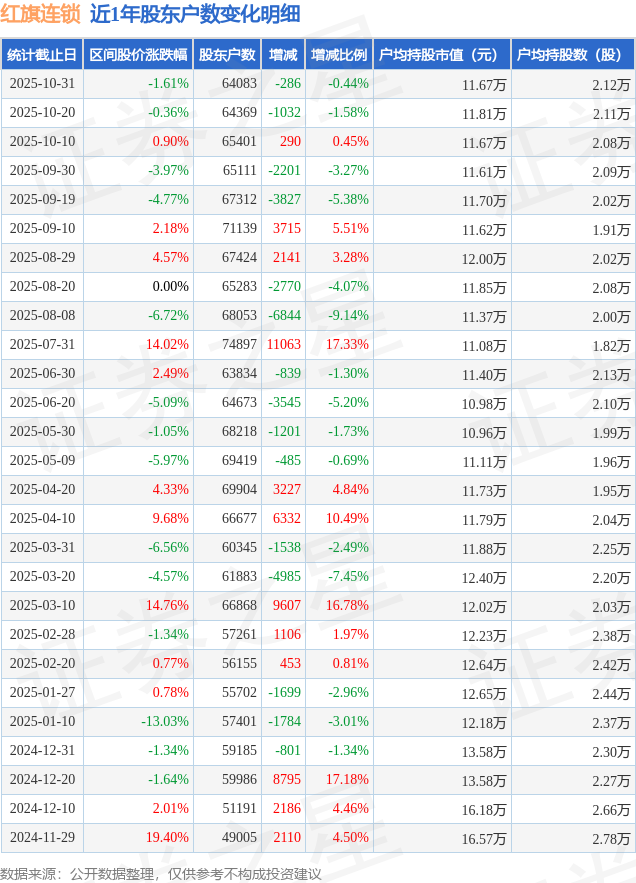 从股价来看,2025年10月20日至2025年10月31日,红旗连锁区间跌幅为1.61%,在此期间股东户数减少286.0户,减幅为0.44%。