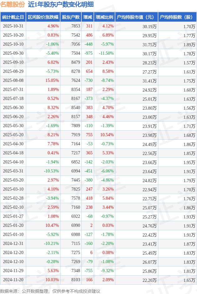 从股价来看,2025年10月20日至2025年10月31日,名雕股份区间涨幅为4.96%,在此期间股东户数增加311.0户,增幅为4.12%。