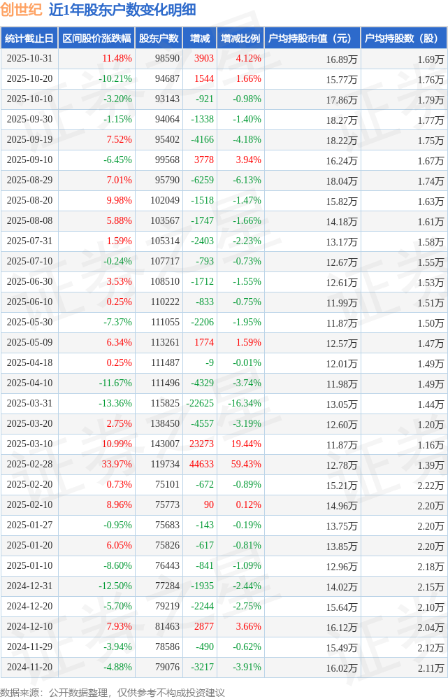 从股价来看,2025年10月20日至2025年10月31日,创世纪区间涨幅为11.48%,在此期间股东户数增加3903.0户,增幅为4.12%。