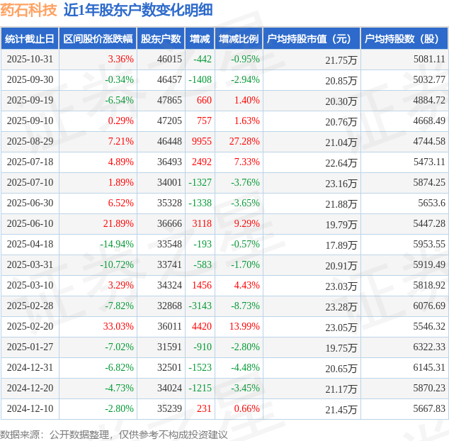 从股价来看,2025年9月30日至2025年10月31日,药石科技区间涨幅为3.36%,在此期间股东户数减少442.0户,减幅为0.95%。