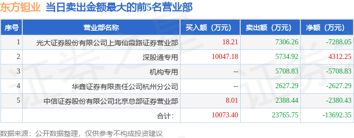 证券之星消息,沪深交易所2025年11月10日公布的交易公开信息显示,东方钽业(000962)因日跌幅偏离值达到7%的前5只证券登上龙虎榜。此次是近5个交易日内第1次上榜。