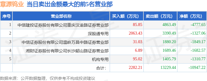 证券之星消息,沪深交易所2025年11月10日公布的交易公开信息显示,章源钨业(002378)因日跌幅偏离值达到7%的前5只证券登上龙虎榜。此次是近5个交易日内第1次上榜。