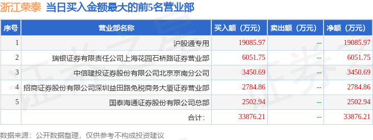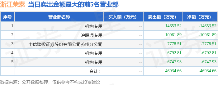 证券之星消息,沪深交易所2025年11月10日公布的交易公开信息显示,浙江荣泰(603119)因有价格涨跌幅限制的日收盘价格跌幅偏离值达到7%的前五只证券登上龙虎榜。此次是近5个交易日内第2次上榜。