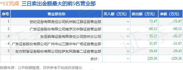 证券之星消息,沪深交易所2025年11月10日公布的交易公开信息显示,*ST元成(603388)因ST、*ST证券连续三个交易日内收盘价格跌幅偏离值累计达到12%的证券登上龙虎榜。此次是近5个交易日内第3次上榜。