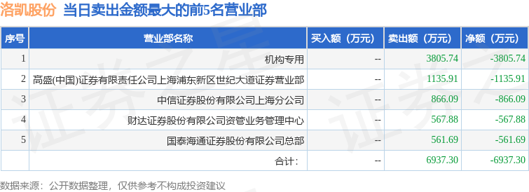 证券之星消息,沪深交易所2025年11月10日公布的交易公开信息显示,洛凯股份(603829)因有价格涨跌幅限制的日收盘价格跌幅偏离值达到7%的前五只证券登上龙虎榜。此次是近5个交易日内第1次上榜。