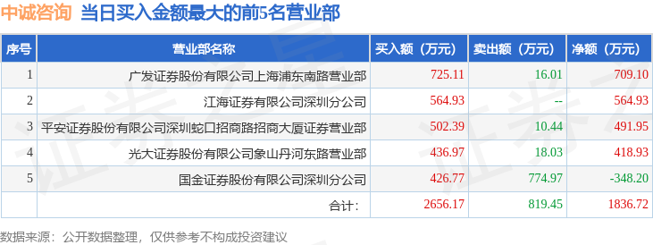 证券之星消息,沪深交易所2025年11月10日公布的交易公开信息显示,中诚咨询(920003)因当日换手率达到20%的前5只股票登上龙虎榜。此次是近5个交易日内第1次上榜。