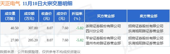 证券之星消息,11月10日天正电气发生大宗交易,交易数据如下: