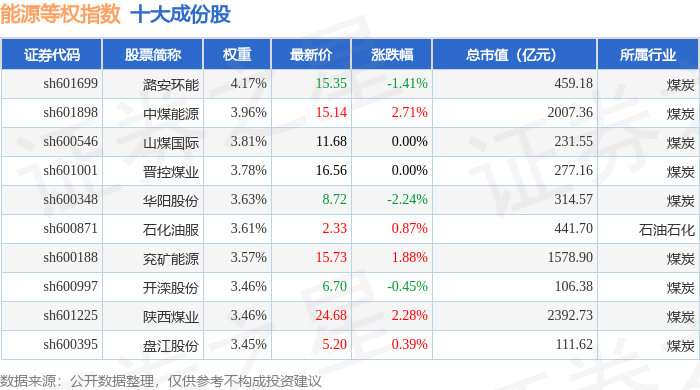 能源等权(000070)指数十大成份股详情如下:
