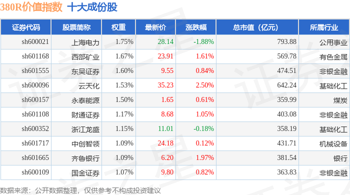 证券之星消息,11月10日,380R价值(000120)指数报收于9834.32点,涨0.64%,成交1421.16亿元,换手率1.8%。当日该指数成份股中,上涨的有186家,首旅酒店以10.01%的涨幅领涨,下跌的有88家,嘉元科技以8.4%的跌幅领跌。