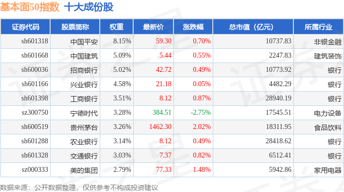 证券之星消息,11月10日,基本面50(000925)指数报收于4731.47点,涨0.65%,成交950.55亿元,换手率0.29%。当日该指数成份股中,上涨的有42家,五粮液以3.47%的涨幅领涨,下跌的有6家,宁德时代以2.75%的跌幅领跌。