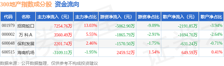 资金流向方面,300地产(000952)指数成份股当日主力资金净流入合计9907.88万元,游资资金净流出合计6039.68万元,散户资金净流出合计3868.2万元。成份股资金流向详情见下表: