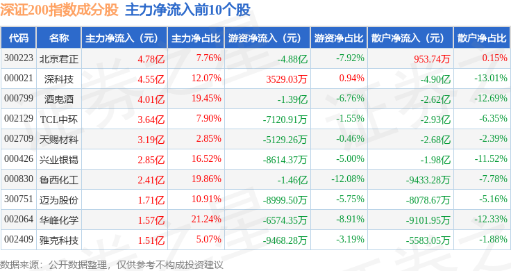 资金流向方面,深证200(399009)指数成份股当日主力资金净流出合计26.28亿元,游资资金净流入合计3.88亿元,散户资金净流入合计22.39亿元。成份股资金流向详情见下表: