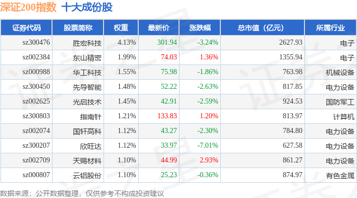 证券之星消息,11月10日,深证200(399009)指数报收于5139.31点,涨0.19%,成交2122.26亿元,换手率2.18%。当日该指数成份股中,上涨的有128家,北京君正以10.22%的涨幅领涨,下跌的有70家,杰瑞股份以7.46%的跌幅领跌。