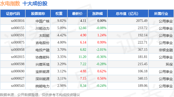 资金流向方面,水电指数(399234)成份股当日主力资金净流入合计4.01亿元,游资资金净流出合计3.22亿元,散户资金净流出合计7882.95万元。成份股资金流向详情见下表: