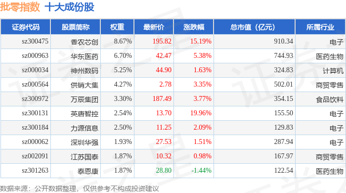 证券之星消息,11月10日,批零指数(399236)报收于1657.32点,涨3.91%,成交400.45亿元,换手率4.39%。当日该指数成份股中,上涨的有80家,英唐智控以19.96%的涨幅领涨,下跌的有17家,云汉芯城以4.57%的跌幅领跌。