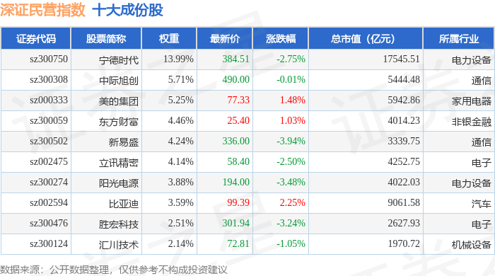 资金流向方面,深证民营(399337)指数成份股当日主力资金净流出合计94.36亿元,游资资金净流入合计7.07亿元,散户资金净流入合计87.29亿元。成份股资金流向详情见下表: