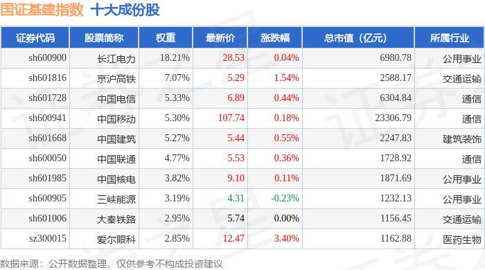 证券之星消息,11月10日,国证基建(399359)指数报收于2774.67点,涨0.52%,成交254.43亿元,换手率0.51%。当日该指数成份股中,上涨的有32家,南网储能以6.07%的涨幅领涨,下跌的有13家,锐捷网络以1.8%的跌幅领跌。