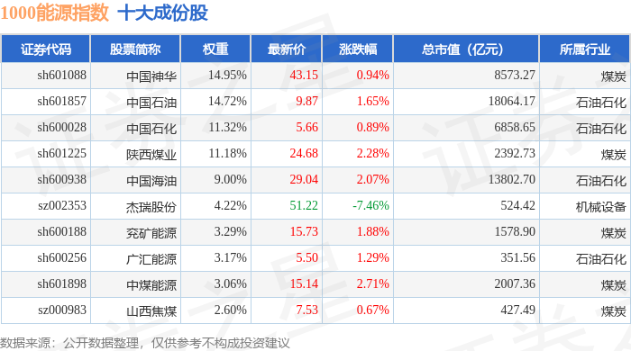 证券之星消息,11月10日,1000能源(399381)指数报收于3162.82点,涨0.47%,成交154.1亿元,换手率0.42%。当日该指数成份股中,上涨的有17家,新集能源以3.49%的涨幅领涨,下跌的有5家,杰瑞股份以7.46%的跌幅领跌。