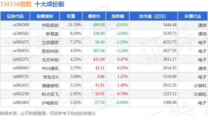 证券之星消息,11月10日,TMT50(399610)指数报收于9197.65点,跌0.54%,成交1501.67亿元,换手率2.16%。当日该指数成份股中,上涨的有26家,北京君正以10.22%的涨幅领涨,下跌的有24家,欣旺达以7.01%的跌幅领跌。