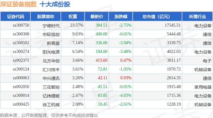 证券之星消息,11月10日,深证装备(399636)指数报收于7825.02点,跌1.8%,成交1664.68亿元,换手率3.19%。当日该指数成份股中,上涨的有28家,晶澳科技以4.23%的涨幅领涨,下跌的有52家,杰瑞股份以7.46%的跌幅领跌。