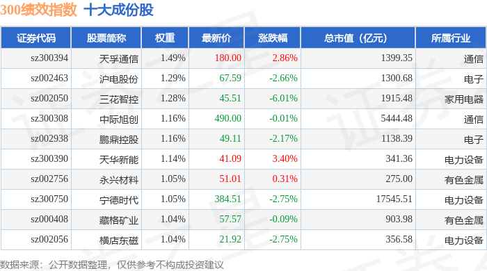 证券之星消息,11月10日,300绩效(399657)指数报收于7193.76点,涨0.72%,成交4544.79亿元,换手率1.75%。当日该指数成份股中,上涨的有203家,北京君正以10.22%的涨幅领涨,下跌的有94家,杰瑞股份以7.46%的跌幅领跌。