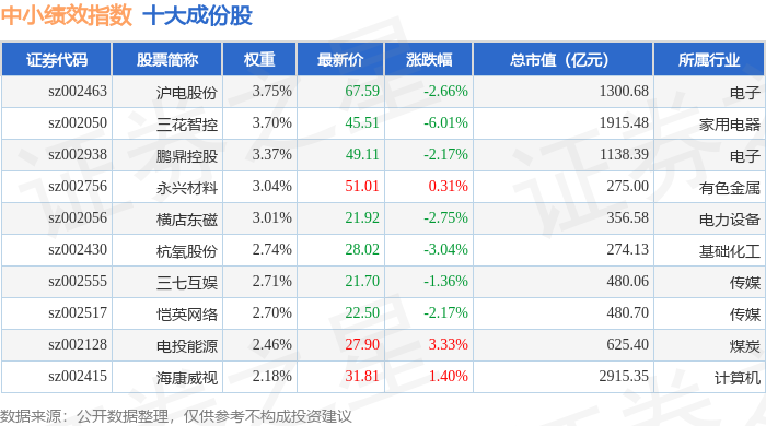 证券之星消息,11月10日,中小绩效(399658)指数报收于4891.24点,涨0.17%,成交1550.63亿元,换手率1.78%。当日该指数成份股中,上涨的有68家,雅克科技以7.58%的涨幅领涨,下跌的有31家,杰瑞股份以7.46%的跌幅领跌。