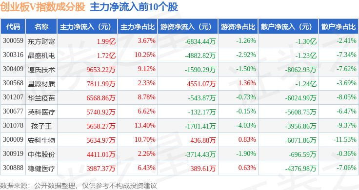 资金流向方面,创业板V(399668)指数成份股当日主力资金净流出合计37.52亿元,游资资金净流入合计8.9亿元,散户资金净流入合计28.61亿元。成份股资金流向详情见下表: