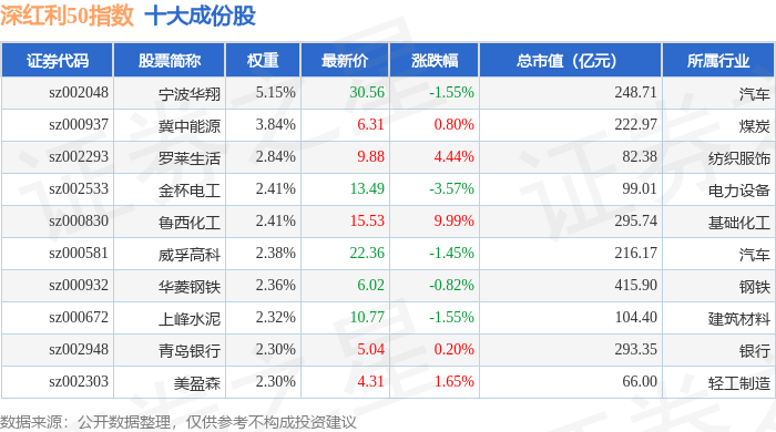 证券之星消息,11月10日,深红利50(399672)指数报收于4275.49点,涨0.93%,成交149.19亿元,换手率1.43%。当日该指数成份股中,上涨的有37家,鲁西化工以9.99%的涨幅领涨,下跌的有12家,金杯电工以3.57%的跌幅领跌。